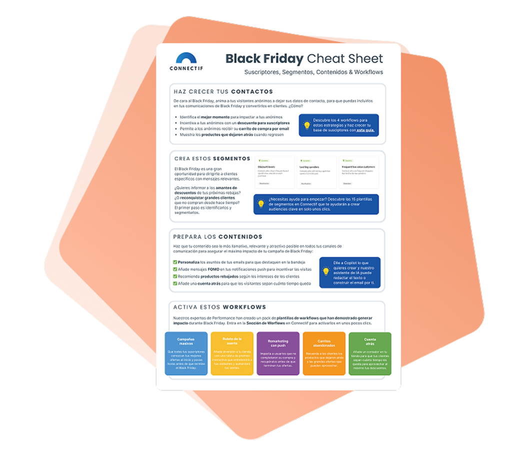 Esta chuleta te ayudará a ponerte en marcha. Incluye ideas para crear segmentos de audiencia, contenidos de campaña, workflows e informes, además de consejos útiles sobre cómo Connectif puede ayudarte a llegar antes a tus objetivos.